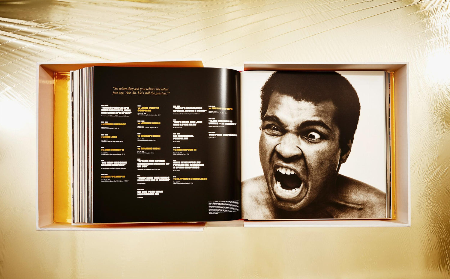 Limited Champ’s Edition of GOAT—GREATEST OF ALL TIME, the ultimate tribute to Muhammad Ali. Each book is signed by Muhammad Ali and Jeff Koons, and presented with the sculpture Radial Champs by Jeff Koons, and four gelatin silver prints of The Champ, each signed by Howard L. Bingham and Muhammad Ali.