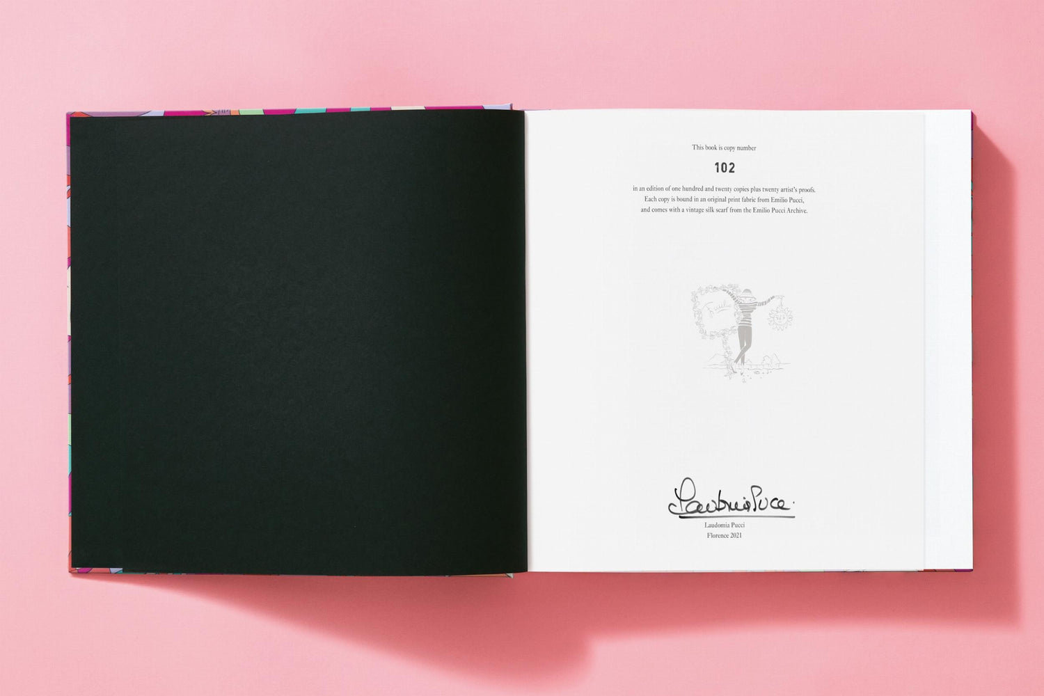 Signed by Laudomia Pucci, this Art edition counts 120 signed and numbered copies. Each copy is bound in one of two different original print fabrics from Emilio Pucci, and comes with a vintage silk scarf from the Emilio Pucci Archive.