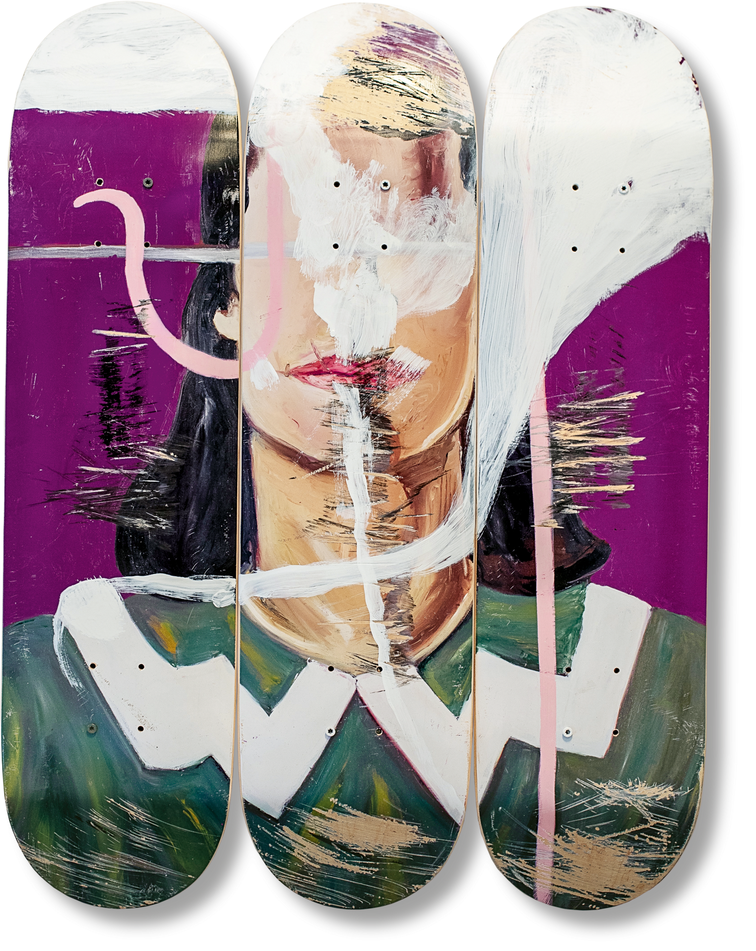 Art Edition Blind Girl/Deep Cobalt Violet, 2023 (No. 1–75), with a set of three skateboards, printed and individually skated by professional skateboarder Eli Reed and Shooter Schnabel, then hand painted and signed by Julian Schnabel. It comes with a numbered copy of the Julian Schnabel monograph.